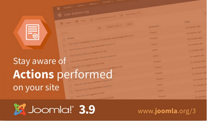 Unataka kujua vitendo gani vya utawala vimefanyika kwenye tovuti yako? Shukrani kwa Joomla 3.9, Watumiaji Wapya wanaweza kuona urahisi mtumiaji gani alifanya, na wakati gani. Na pia inafanya kazi na upanuzi wa mkono! Kagua batli ya kitendo, uifirishe na uondoe funguo. Hutakosa hila, kwa shukrani kwa moduli za vitendo vya hivi karibuni ambavyo vinaweza kuongezwa kwenye paneli yako la kudhibiti.